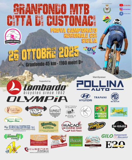 Per la prima volta una Granfondo Mtb interamente nel territorio Custonacese!!! Un percorso Unico che porterà i Bikers dalla Baia di Cornino fino alla Riserva Monte Cofano e ai quasi 1000 metri del Monte Sparacio....